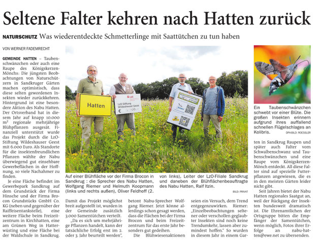 In 2025 startet der NABU Hatten eine große Blühflächenaktion in der Gemeinde Hatten. Auf geeigneten größeren Flächen unter anderem auf Gewerbegrundstücken sollen Blühflächen angelegt werden, die allen Insekten Nahrungsquelle und Schutz bieten sollen.